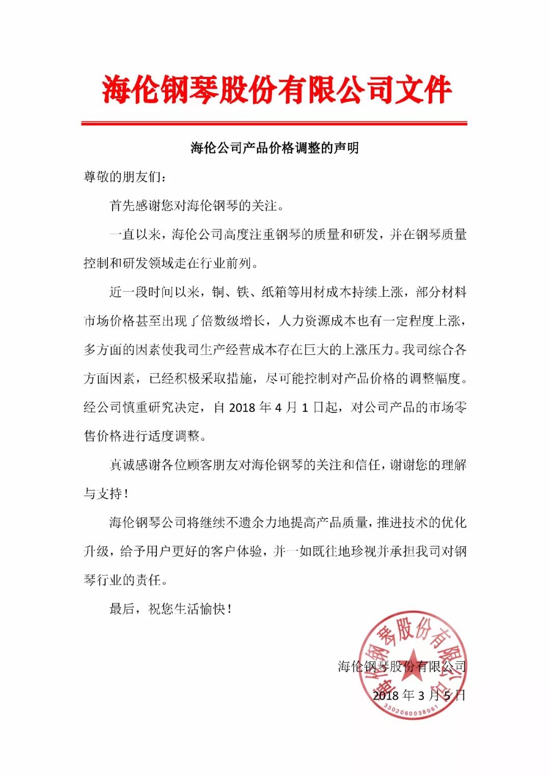 2018海倫公司產品價格調整的聲明
