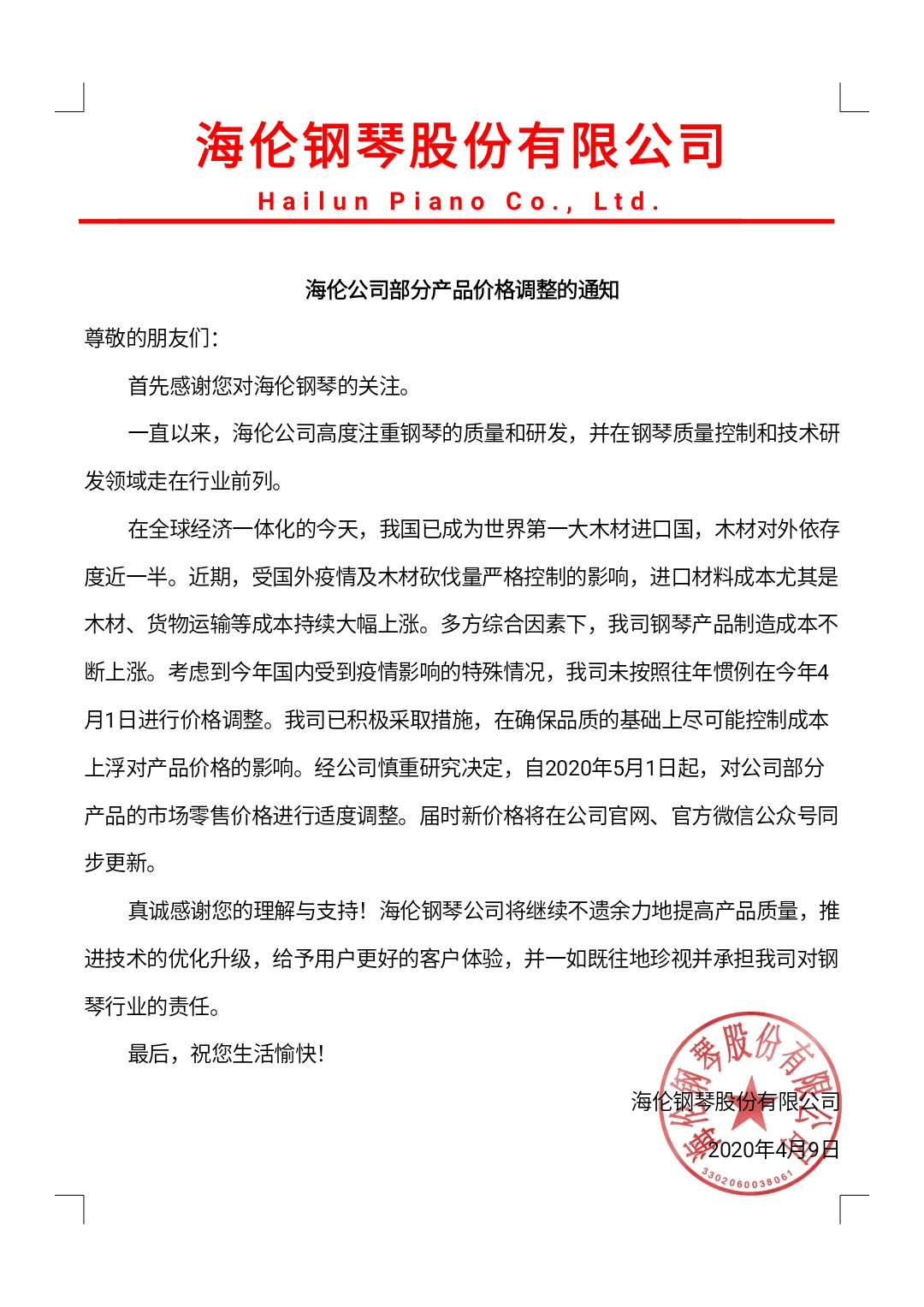 2020海倫公司產品價格調整的通知