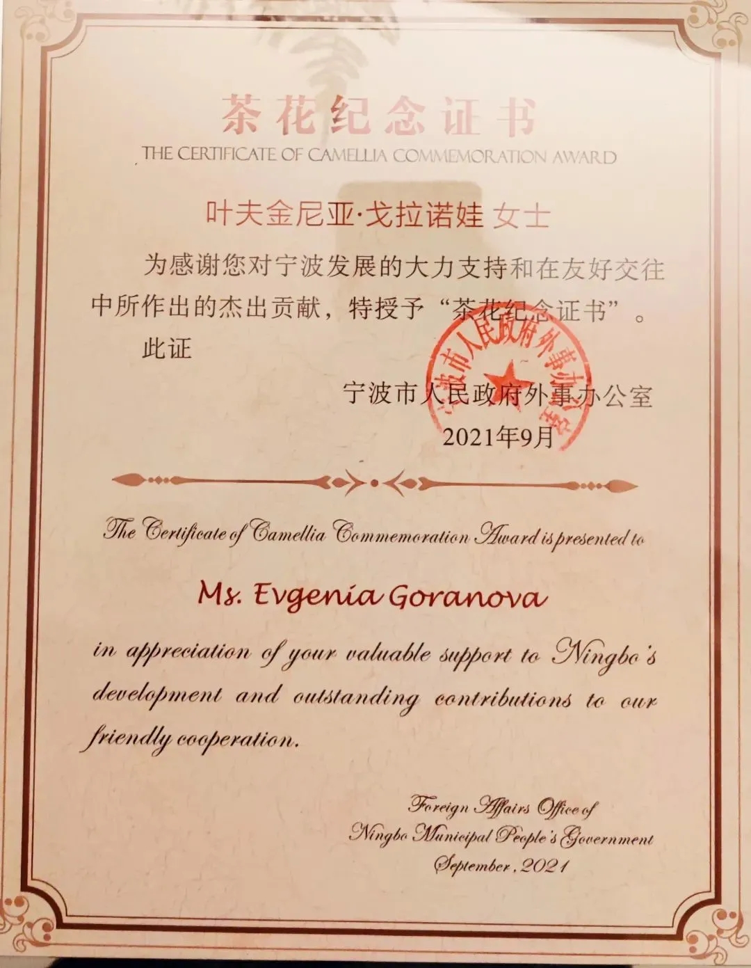 “茶花友誼證書”“茶花紀(jì)念證書”是我市專門為對寧波經(jīng)濟(jì)建設(shè)和社會發(fā)展作出突出貢獻(xiàn)的外國專家設(shè)立的。今年,海倫音樂中心葉夫金尼亞·戈拉諾娃等8位在甬外國專家獲得“茶花紀(jì)念證書”。