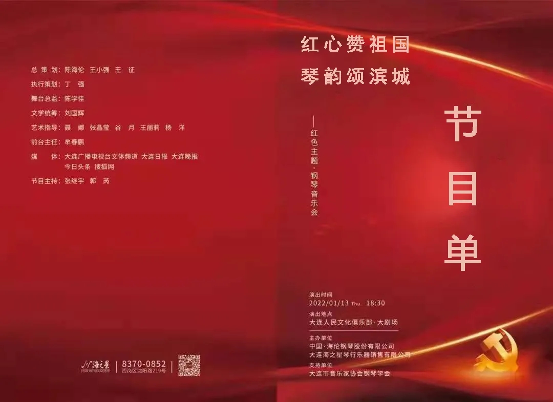 值此中國共產黨百年華誕剛過之際,為增強大連市鋼琴人才的藝術交流,共頌中國共產黨百年輝煌。由中國海倫鋼琴股份有限公司、大連海之星琴行銷售有限公司主辦,大連市音樂家協會鋼琴學會支持的紅心贊祖國,琴韻頌濱城——紅色主題鋼琴音樂會將于2022年1月13日華麗開啟。眾多大連優秀的鋼琴演奏家,將以音樂演繹青春風采、以音樂展現藝術風貌、以音樂禮贊偉大祖國。
