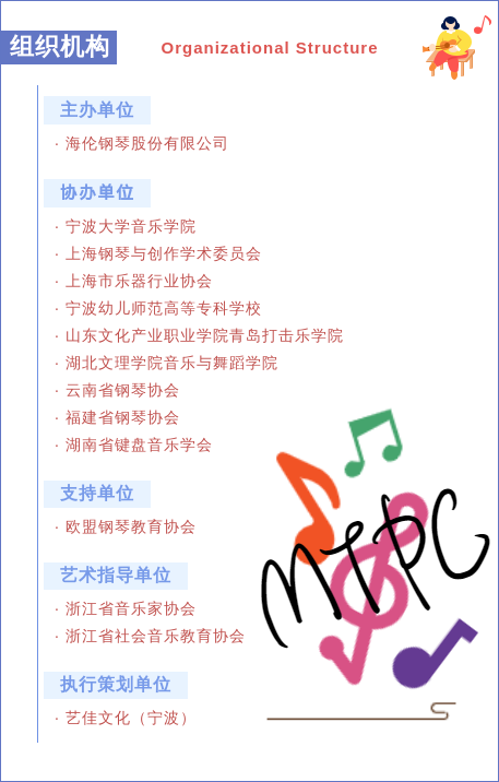 2022(第五屆)MTPC 音才獎(jiǎng)寧波鋼琴藝術(shù)節(jié),在世界鋼琴行業(yè)異軍突起影響卓著的中國(guó)鋼琴品牌—海倫鋼琴的支持下,迎來(lái)了它蓬勃發(fā)展的第 5 年。每屆藝術(shù)節(jié)都?xì)v時(shí)長(zhǎng)達(dá)半年以上,幾十個(gè)藝術(shù)節(jié)運(yùn)營(yíng)中心、百個(gè)城市合作機(jī)構(gòu)加持合作,覆蓋全國(guó)二十多個(gè)省份,同時(shí)在線下和網(wǎng)絡(luò)平臺(tái)搭載數(shù)十場(chǎng)音才講座、大師特訓(xùn)班、音樂(lè)會(huì)等系列活動(dòng),一步步將藝術(shù)節(jié)活動(dòng)規(guī)模推向新的頂峰。自 2018 年創(chuàng)始,秉著更專(zhuān)業(yè)更活力更開(kāi)放的準(zhǔn)則,一步一個(gè)腳印踏實(shí)向前步進(jìn),至目前,直接參與人數(shù)已超十萬(wàn),累計(jì)觀眾超百萬(wàn)。藝術(shù)節(jié)期間,歷年來(lái)邀請(qǐng)鮑蕙蕎、李民、謝哲邦、米蘭·弗朗尼克、彼得·保羅·凱拉夫、格雷厄姆·斯科特等擔(dān)任藝術(shù)節(jié)主席或藝術(shù)顧問(wèn),強(qiáng)大的鋼琴藝術(shù)領(lǐng)域聯(lián)合陣容,加上幾十位國(guó)內(nèi)外音樂(lè)名家、教育家齊聚,傾力助陣參與音樂(lè)嘉年華,成就一場(chǎng)極具規(guī)模、層次、影響力的權(quán)威藝術(shù)盛典。