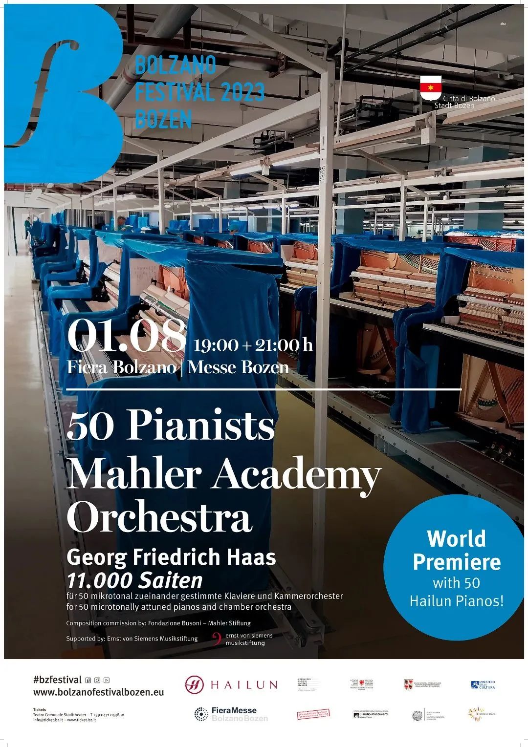 這是奧地利著名作曲家格奧爾格·弗里德里希·哈斯(Georg Friedrich Haas)受“費魯奇奧·布索尼·古斯塔夫·馬勒基金會”委約而為室內(nèi)樂隊與50臺鋼琴而創(chuàng)作的《11,000根弦》的世界首演,在博爾扎諾音樂節(jié)上完美演出。